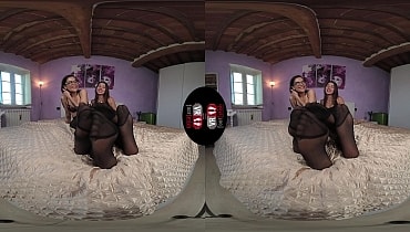 Brunette power: Chiara and Petra lay down in a bed in black nylons.