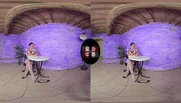 Sexy schoolgirl Chiara looks hotter than a summer heatwave in a Sailor Moon-like outfit consisting of a blue miniskirt, a red bow, white thigh-high stockings with lace trim along the top and black ballet flats. She doesn’t feel like studying today. The sexy brunette teases you with some shoe dangling, lets her shoes drop to the floor and does plenty of toe pointing, wiggling, spreading and flexing. She then props her shapely legs on a little round table, rolls down her stockings and flaunts her delectable feet.